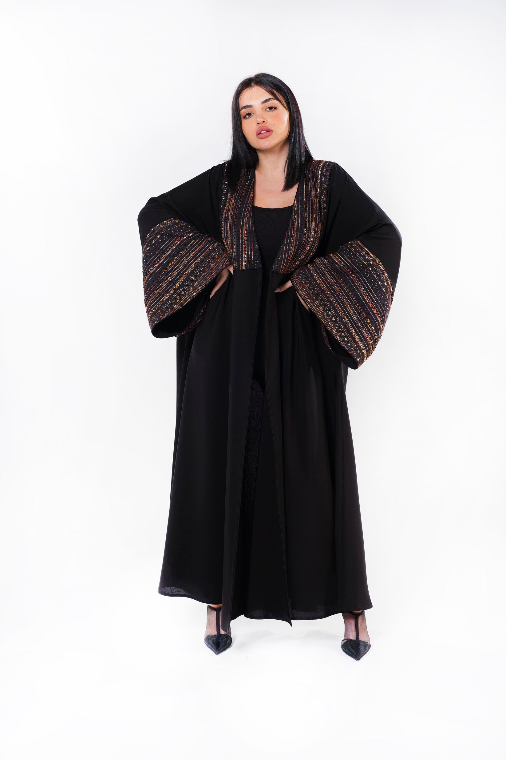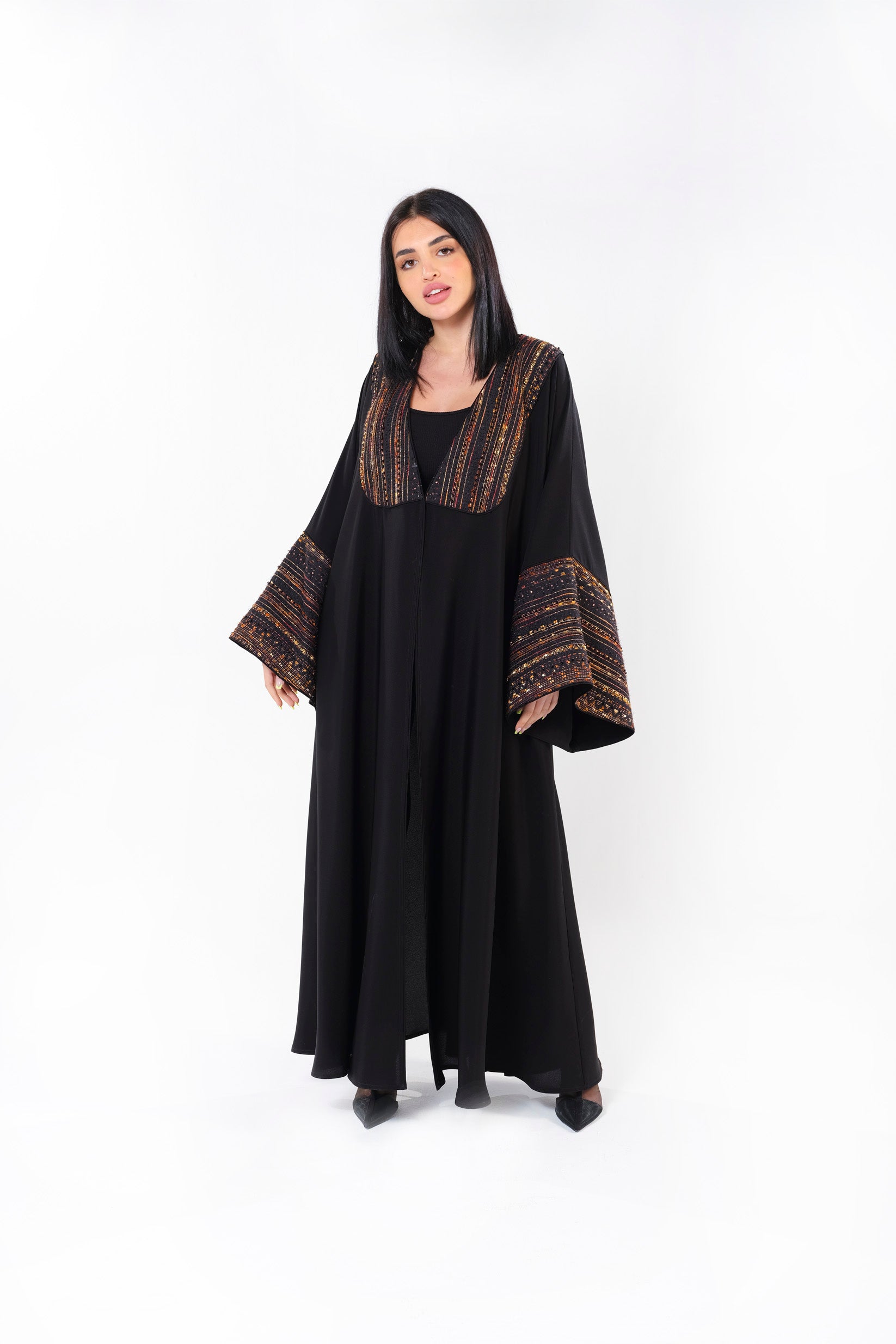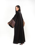 عباية بقماش جاكار وتفاصيل وحدة العمل بالتطريز اليدوي.