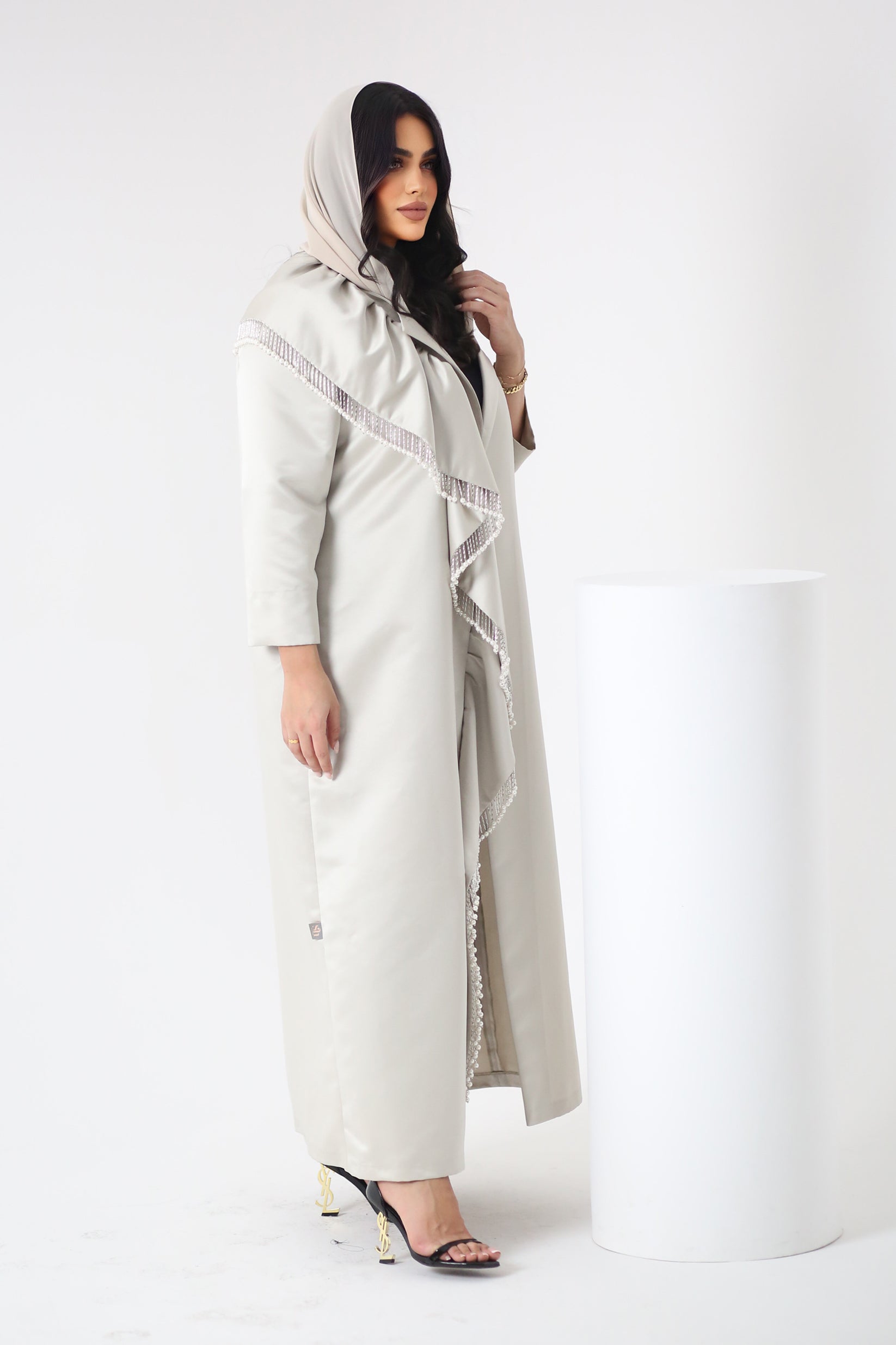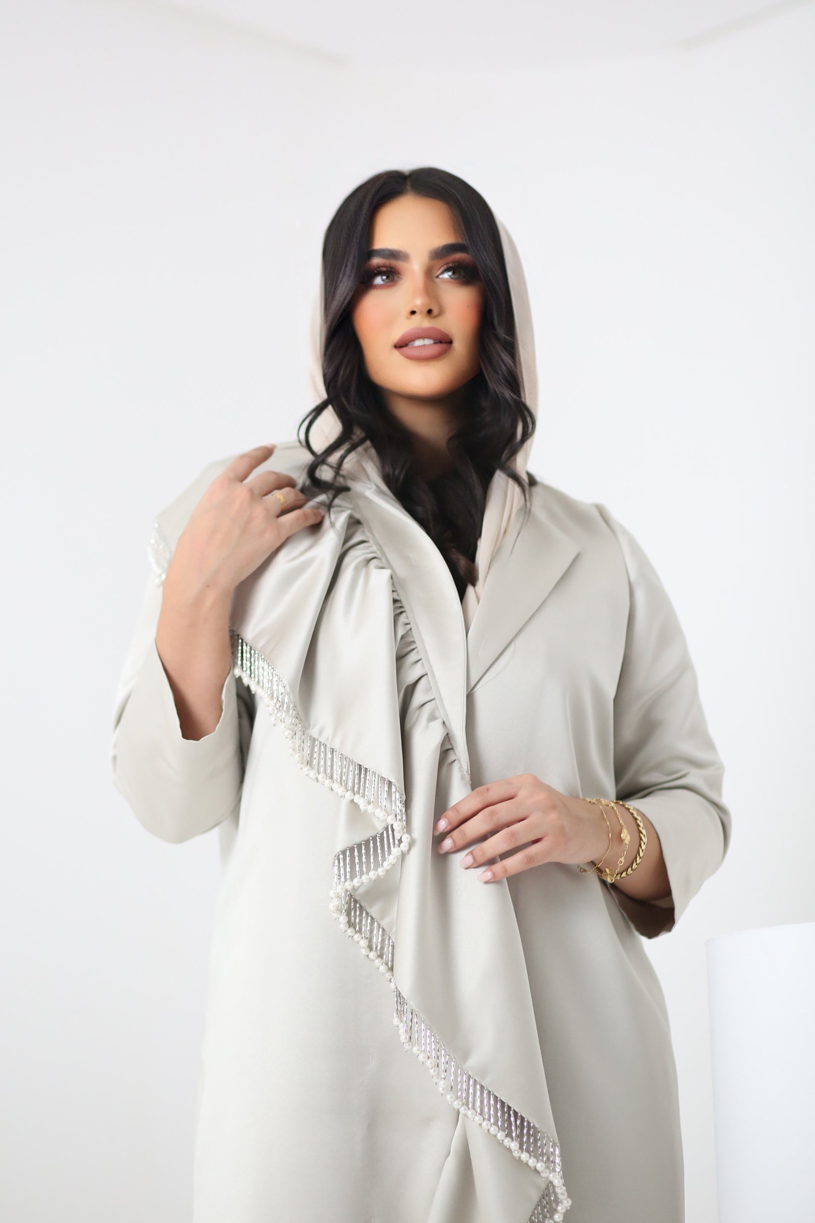 عباءة ذات تركيبة ملائكية تسرق المشهد، وتتلألأ سواروفسكي يا بيرلز، هذه العباءة تزيل التوتر من ارتداء الملابس لأنها تحتوي على كل شيء.