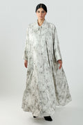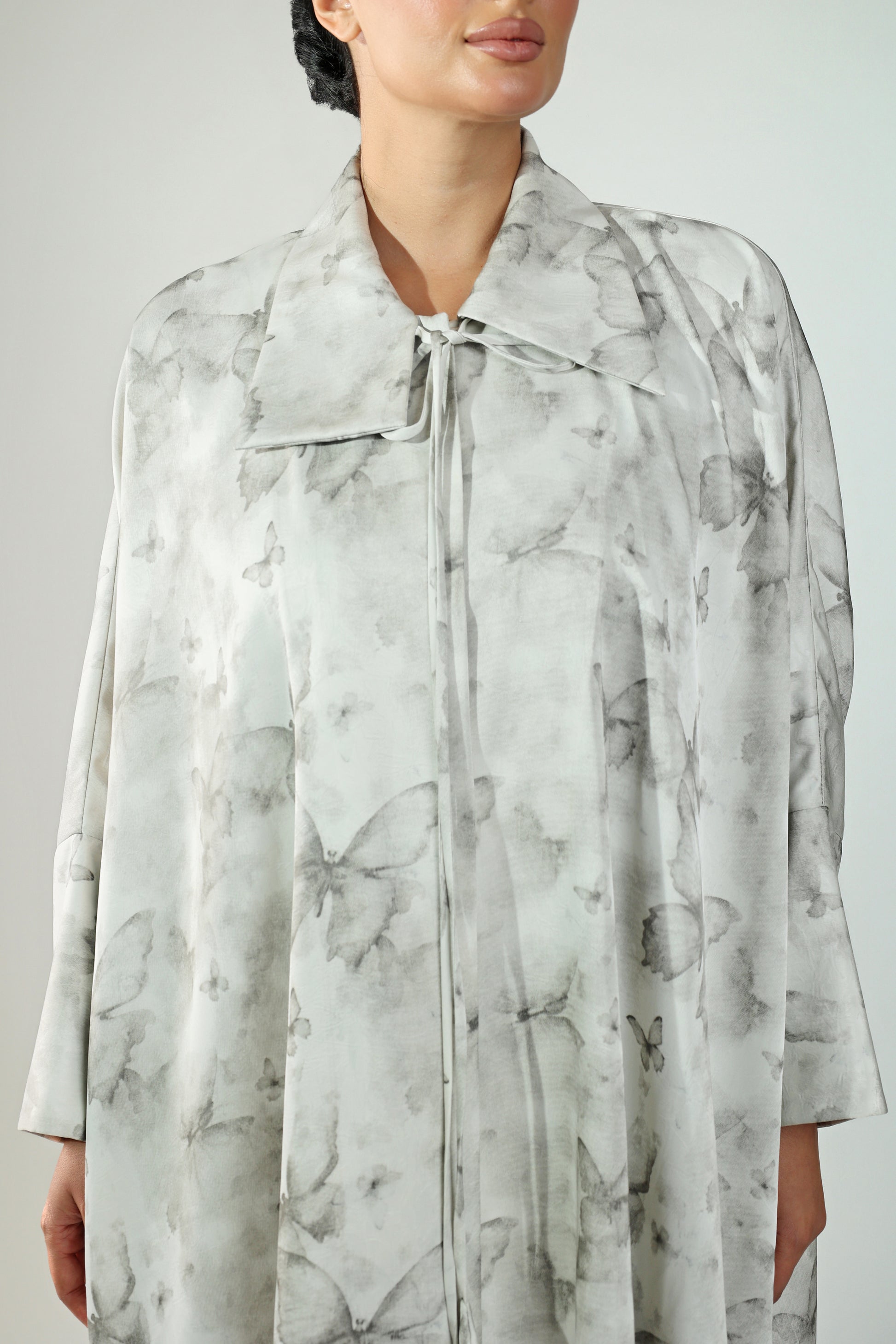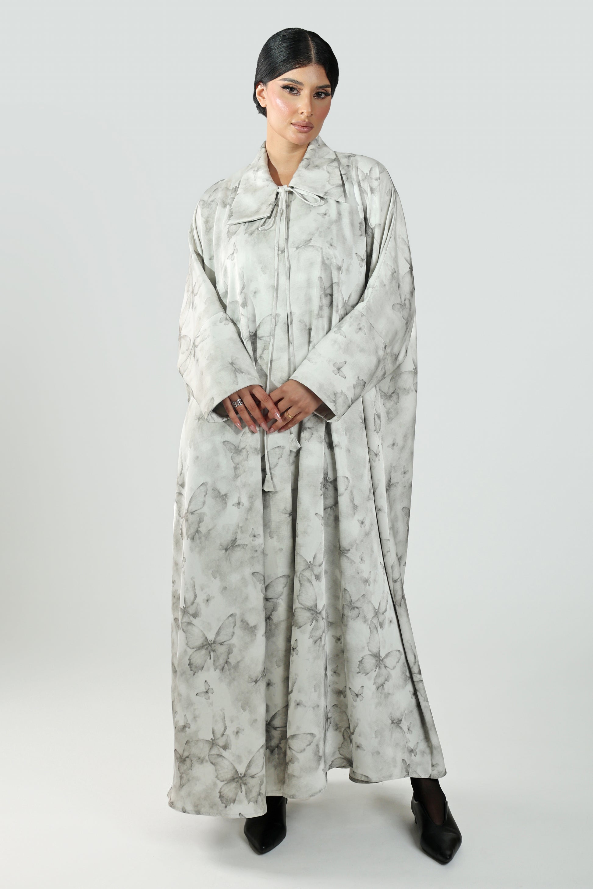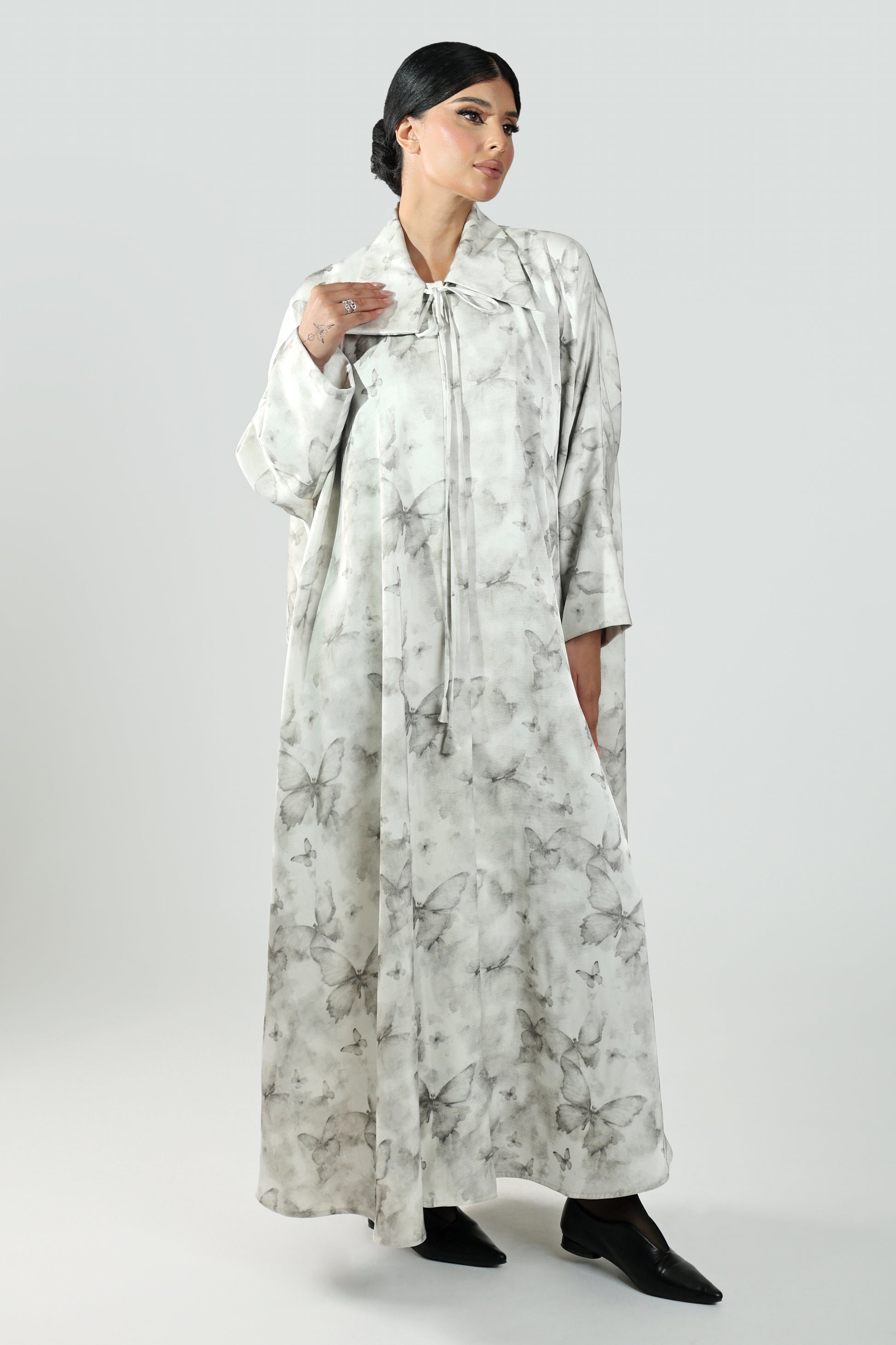 عبايه بخام الكريب المشجر لون أبيض بنقشة فراشات مغلقه واسعه ساحرة و جذابة