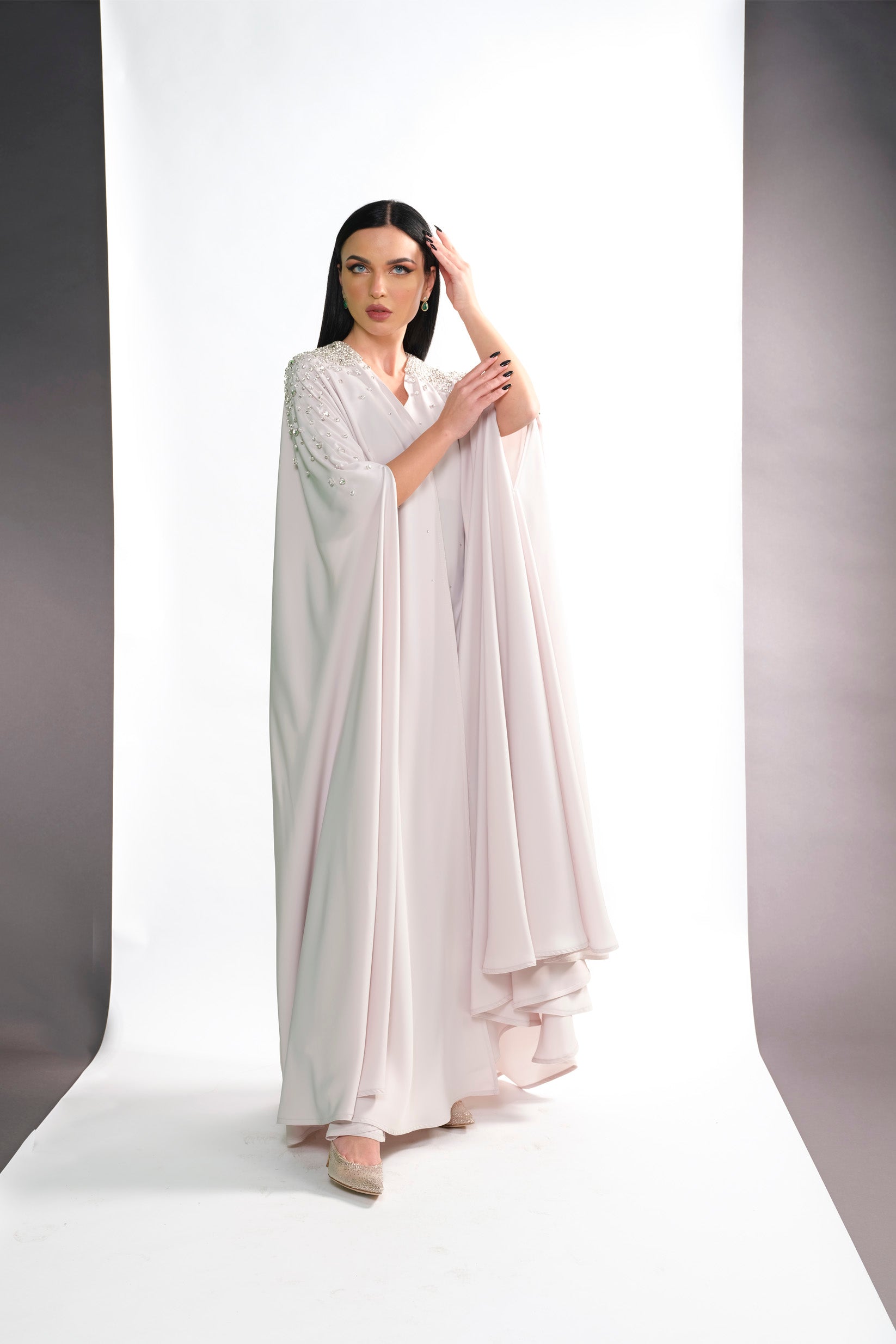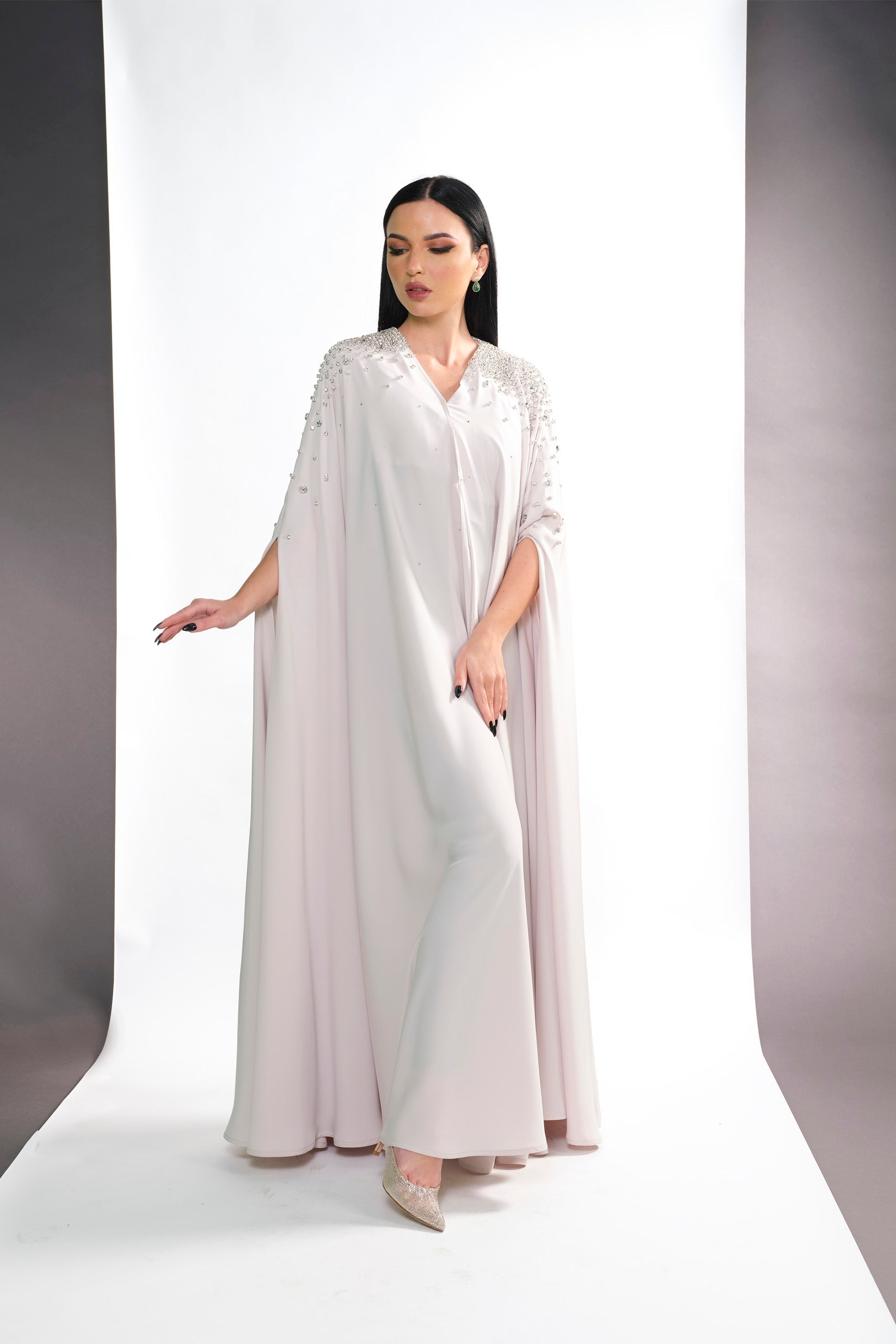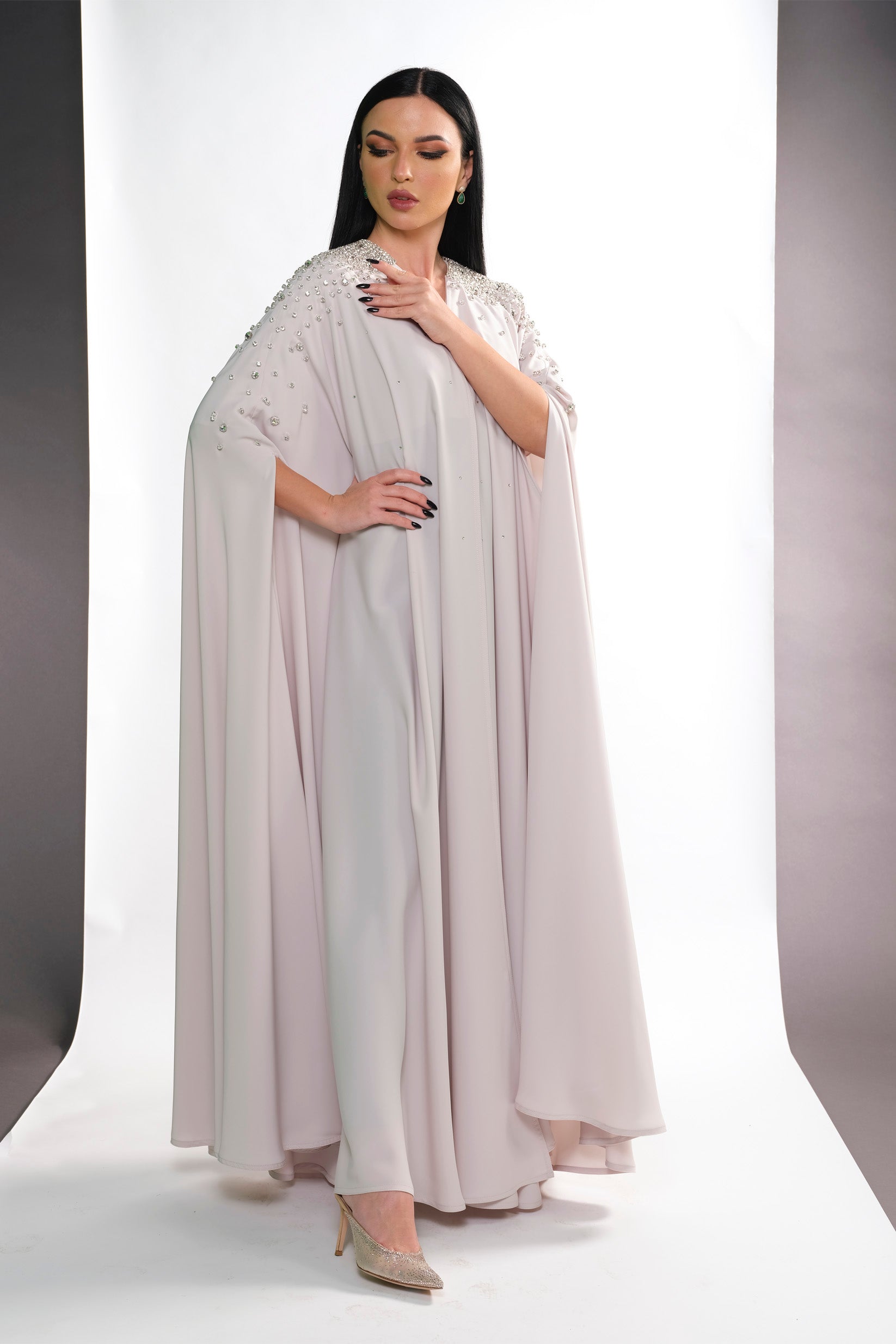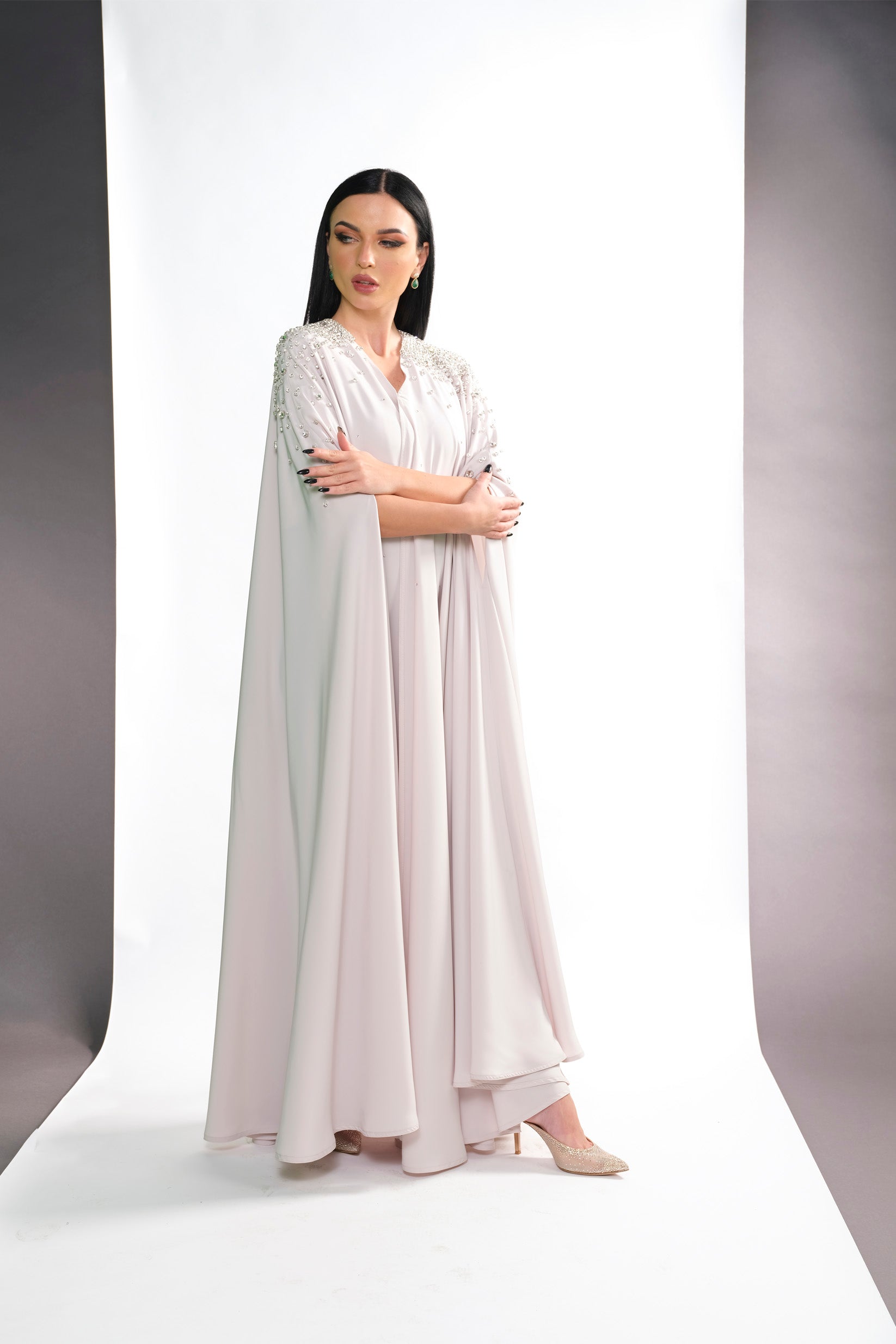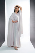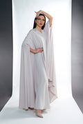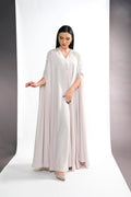 BEIGE CREPE CRYSTALIZED OPEN ABAYA.