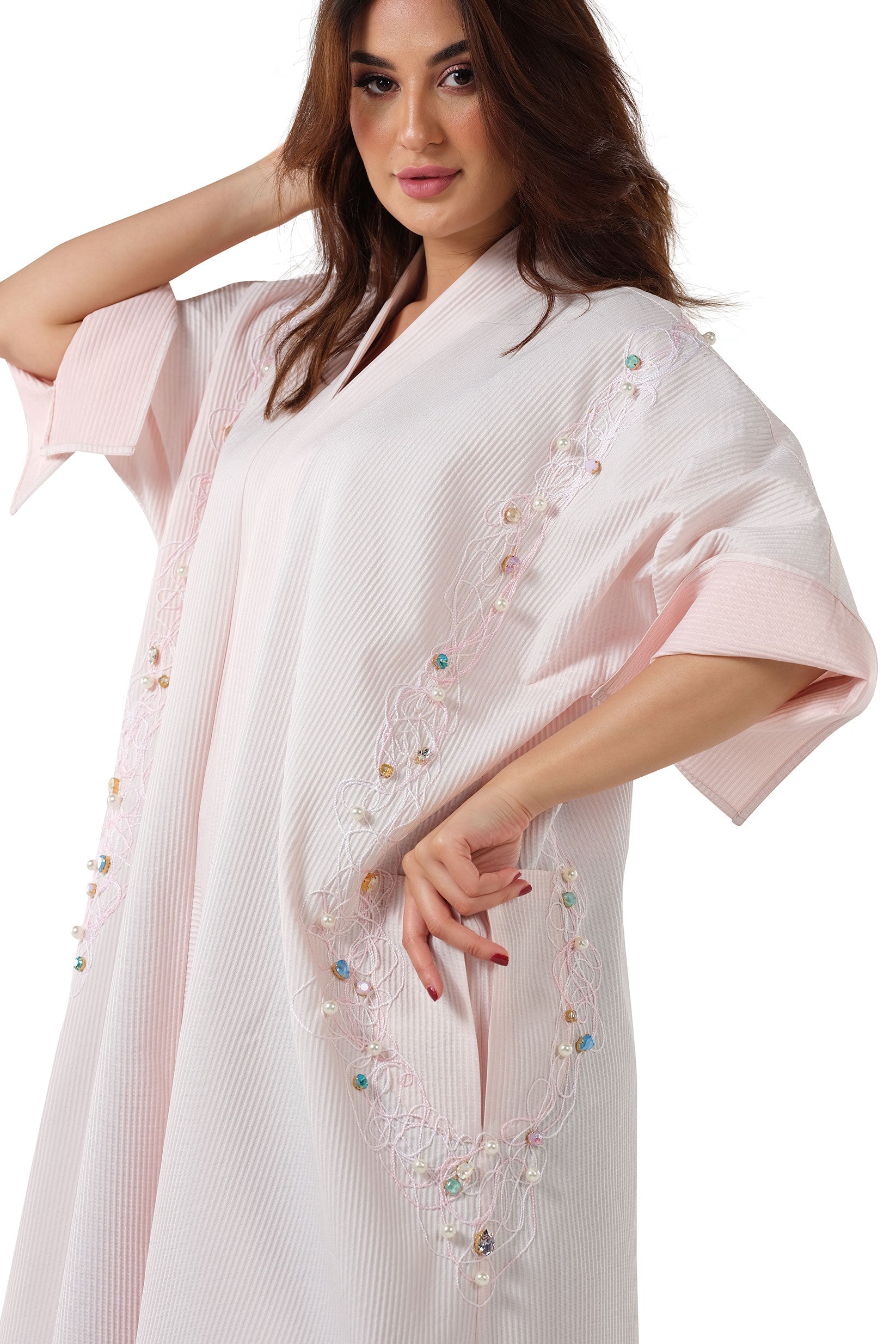 THIS ABAYAS WITH ¾ SLEEVE AND THERE ARE THREADS SPREAD ON THE ABAYA AND THREAD ARE STITCHED WITH THE EMBROIDERY. TO GIVE A MORE EXPENSIVE LOOK WE ADDED A DIFFERENT COLOR OF CRYSTAL ON IT.